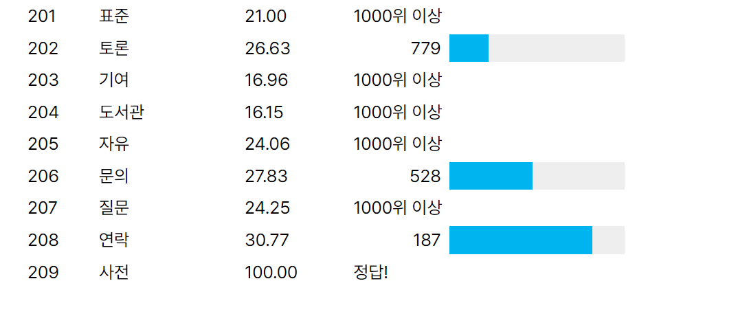 하루에 한 번, 오늘의 단어를 맞혀보세요. 단어를 입력하면 정답 단어와의 유사도를 보여줍니다.